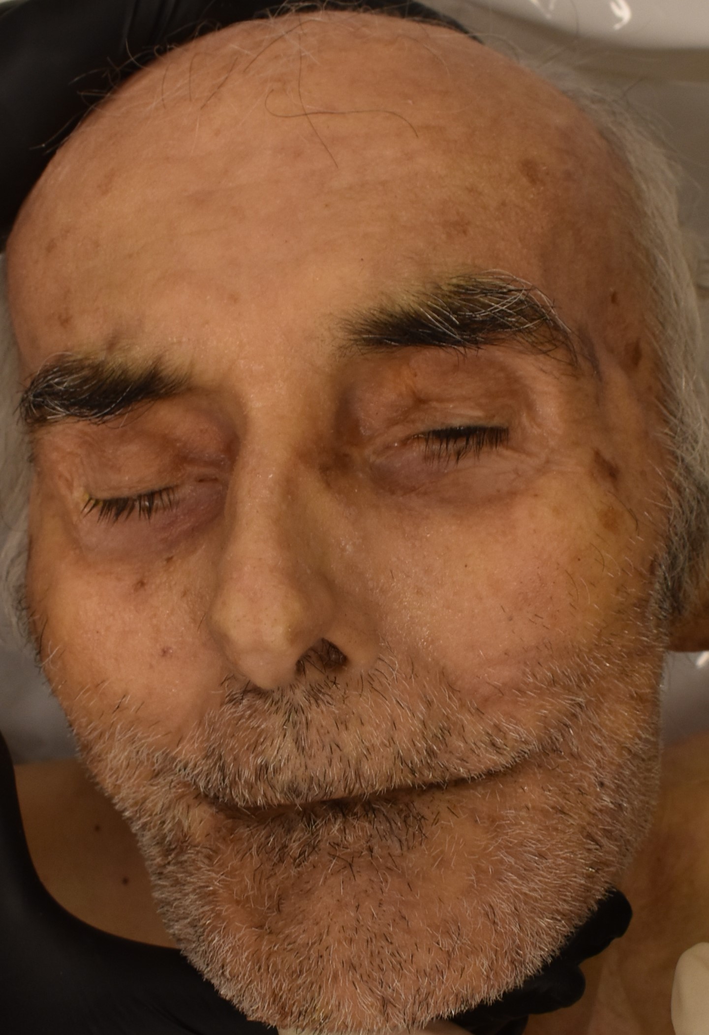 bald on top, white grey hair on sides