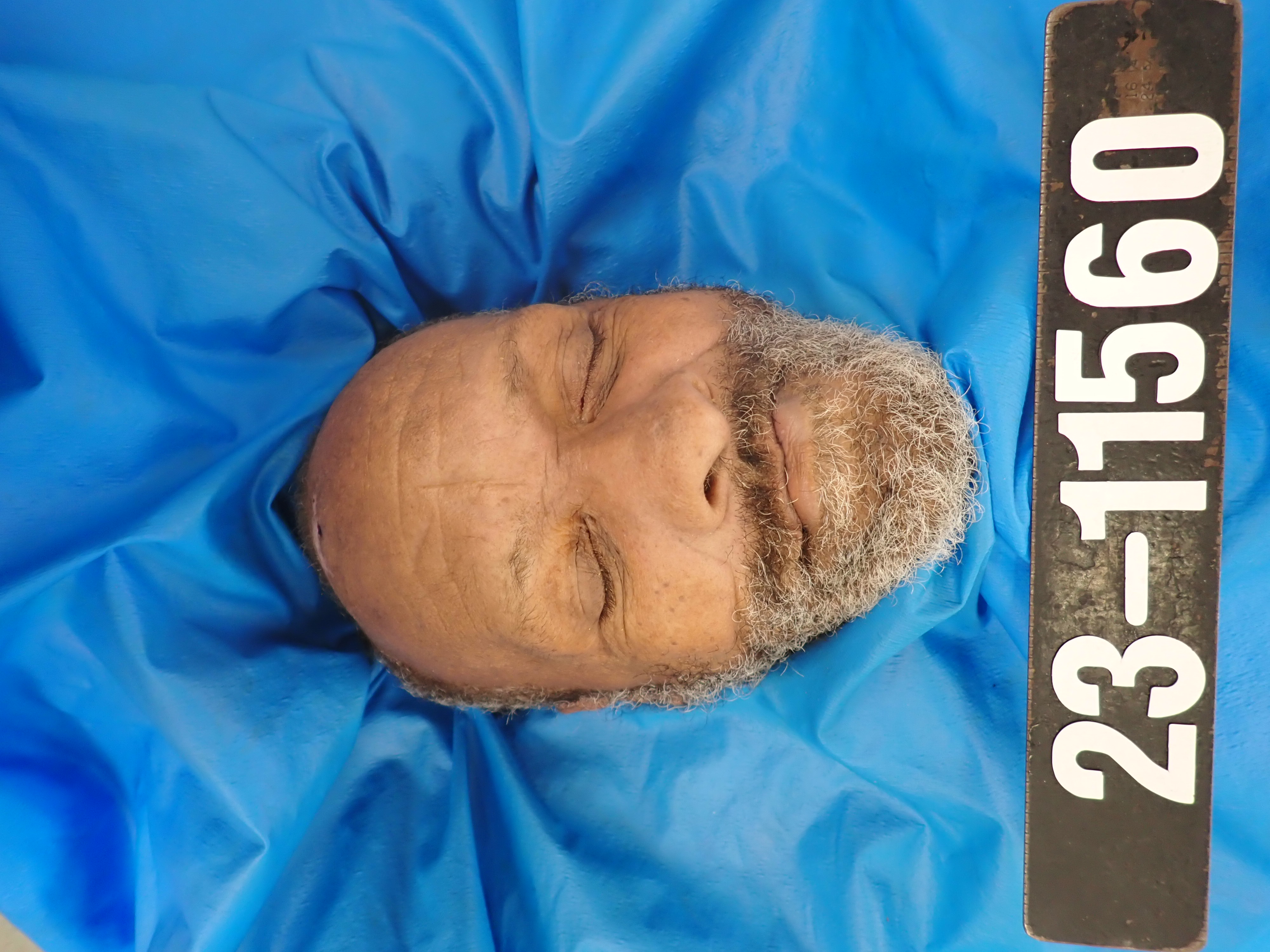 The decedent's hair is balding on the top and short on the sides.