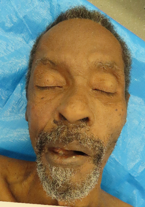 The scalp hair is black and gray, short, and tightly curled.