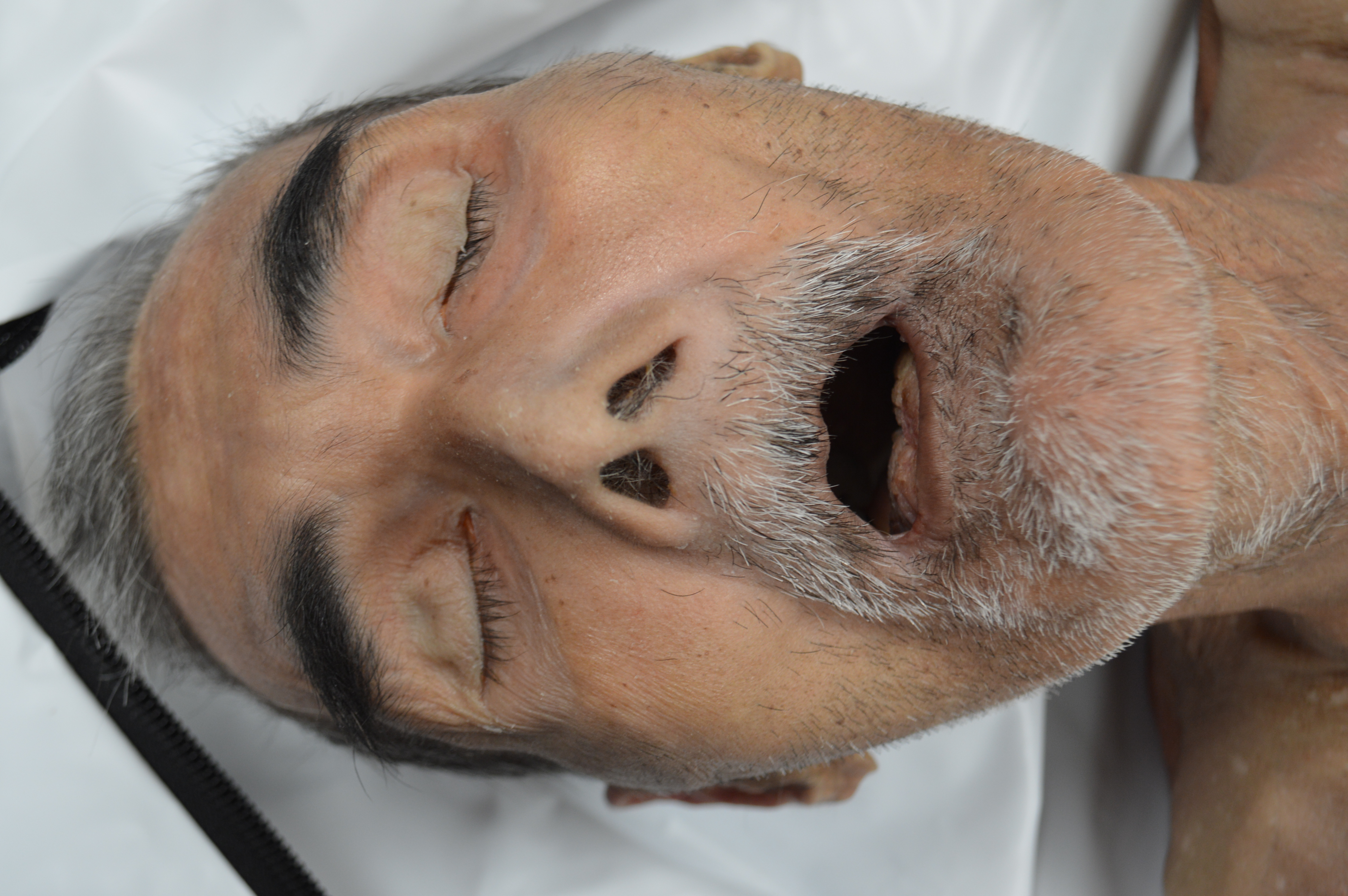 Short, thick salt and pepper hair.