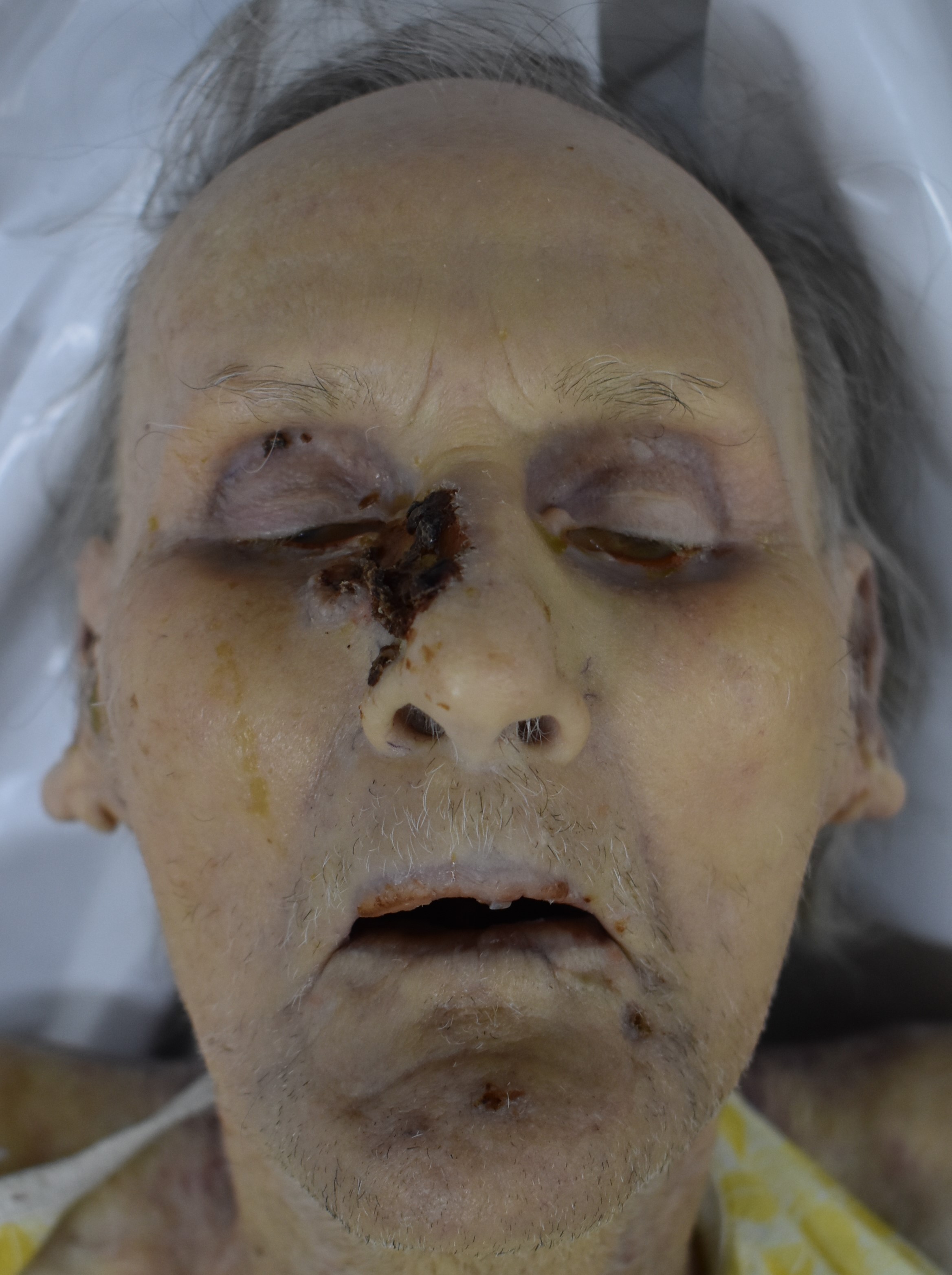 bald on top, ~2 in ling grey hair on sides
