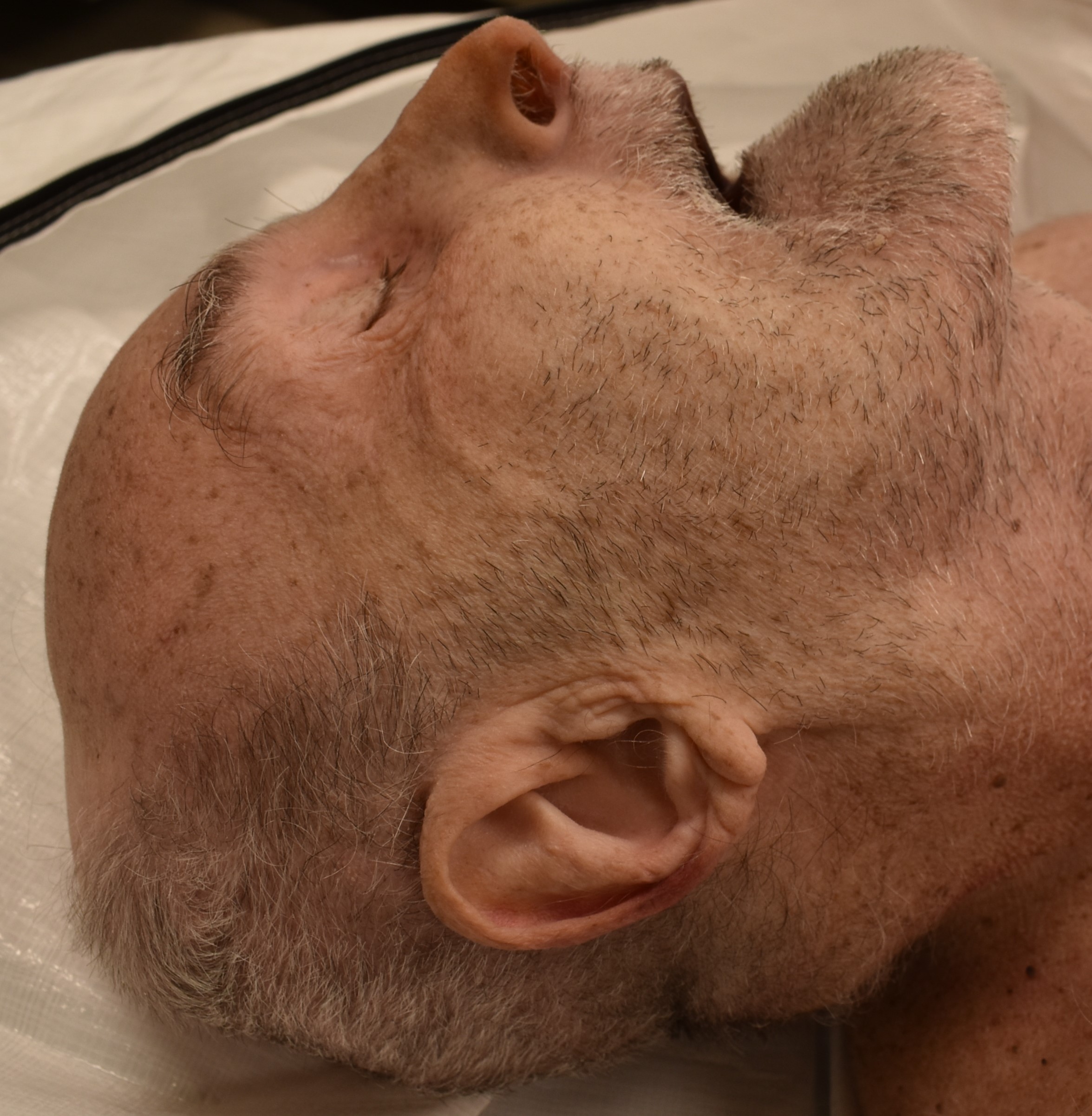bald on top, short grey hair on sides of head
