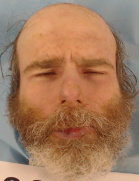 Straight, brown/gray hair. Balding on top and back of head