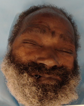 Tightly curled black hair with some gray. Beginning balding on the back of the head.