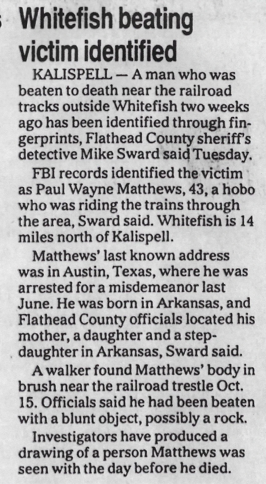 Paul Wayne Matthews, a 43-year-old White male, was found dead on October 15, 1995, in a camp outside Whitefish, Montana—a place where drifters gathered near the tracks, cooking over small fires and trading stories about the next freight heading out. The discovery ended a journey that had carried him across states and into the margins, and it began a homicide investigation that would soon intersect with a broader pattern of killings along the rails.