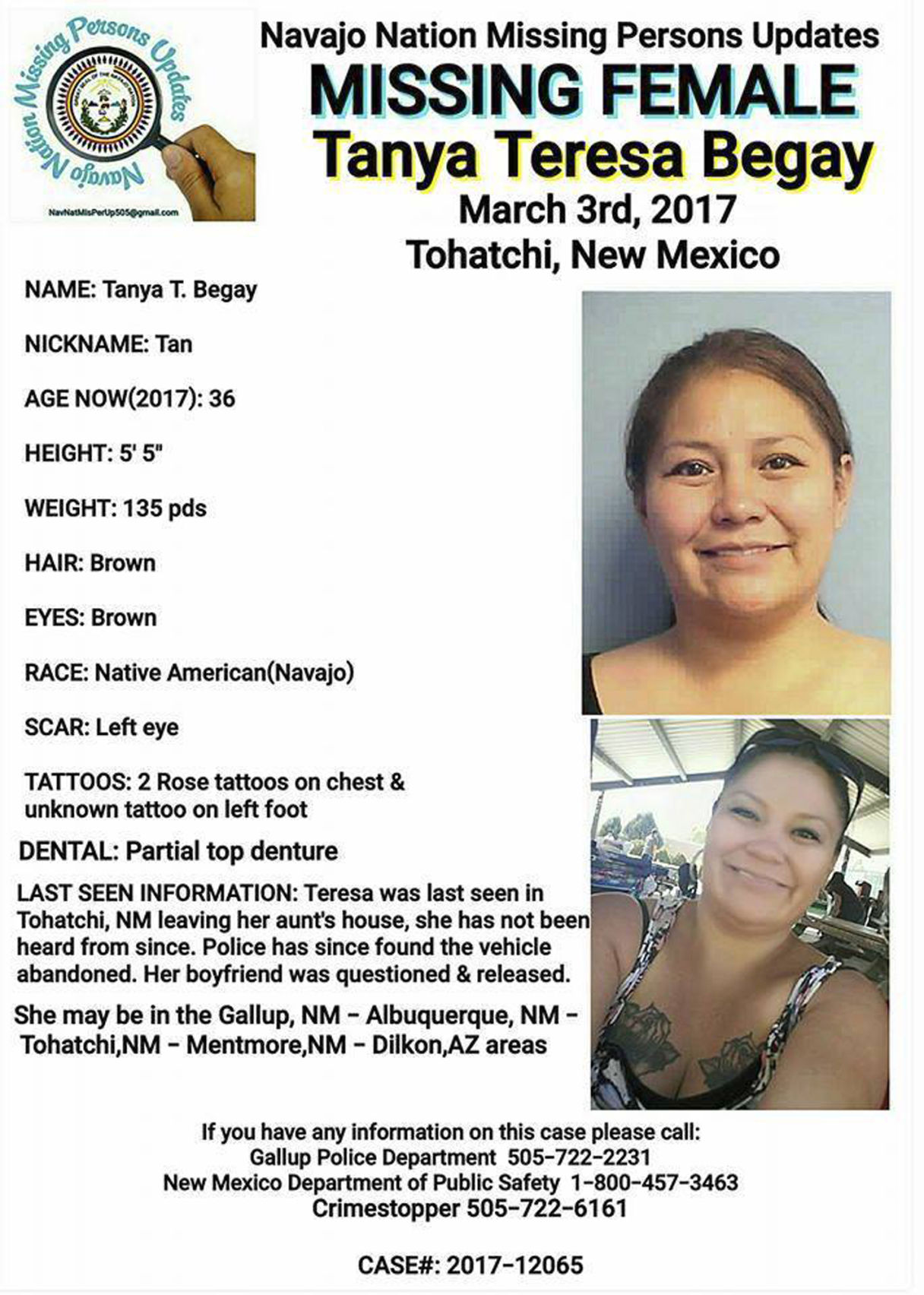 Tanya Teresa Begay, a 36-year-old Native American woman of Navajo descent, vanished on March 3, 2017, after last being seen in Tohatchi, New Mexico. Tanya had planned to travel from Leupp, Arizona, to her family's home near Gallup, New Mexico—a trip that should have taken only a few hours. She was accompanied by her boyfriend at the time, Jason Alan Thornburg, and they had stopped at her father's home in Tohatchi to ask for money. This visit marked the last confirmed sighting of Tanya by her f