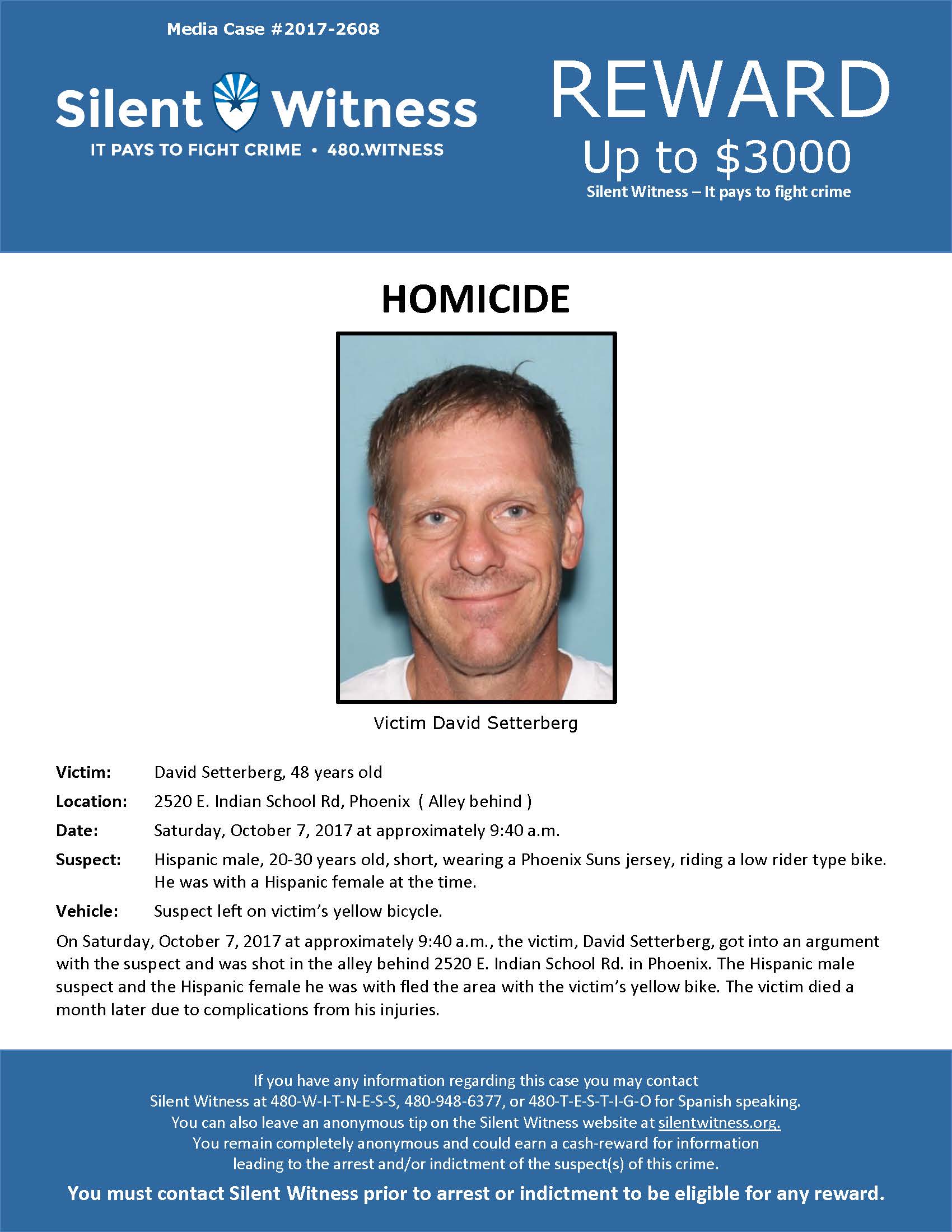 In the fall of 2017, a dispute in a Phoenix alleyway tragically escalated, leading to the death of David Allen Setterberg. On the morning of Saturday, October 7, 2017, at approximately 9:40 a.m., Setterberg was involved in an argument with an unidentified man and woman. The confrontation took a violent turn when the male suspect shot Setterberg in the alley located behind 2520 E. Indian School Rd. Following the shooting, the male suspect and his female companion fled the scene, taking with them
