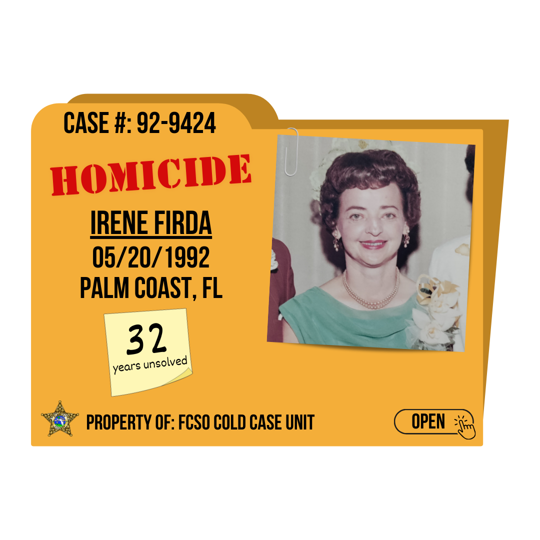 Do you know who murdered 68 year old Irene Firda in 1992? On May 20, 1992, Irene Firda, age 68, was found murdered in a wooded area behind a neighborhood in Palm Coast, Florida. The discovery of her body marked the beginning of an investigation that remains unsolved to this day. Despite the efforts of local authorities, no suspect has been identified, and the circumstances leading to her death are still largely unknown. Firda's case has remained a cold case, and authorities have urged anyone with potential information to come forward in the hopes of so