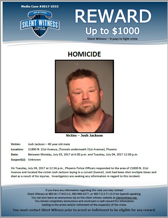 Joshua Jackson, a 40-year-old White / Caucasian male from Phoenix, Arizona, was found fatally shot in a concrete culvert on July 4, 2017, in the north Phoenix desert near 31st Avenue and Deer Valley Road. Responding police and fire personnel discovered him around mid-day lying on a makeshift bed, wearing only underwear, with multiple gunshot wounds; the medical examiner later documented five gunshot injuries and ruled the manner of death a homicide. The location, a drainage tunnel or culvert not