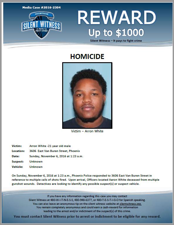 On Sunday, November 6, 2016, at about 1:23 a.m., Phoenix police were dispatched to the Escala Central City apartment complex at 3606 East Van Buren Street after multiple 911 calls reported gunfire in the area. When officers arrived, they found Aaron Jarel White, a 21-year-old Black / African American man, lying at the scene with multiple gunshot wounds. He was pronounced dead where he was found; there is no indication in public reports that he was transported to a hospital before being declared