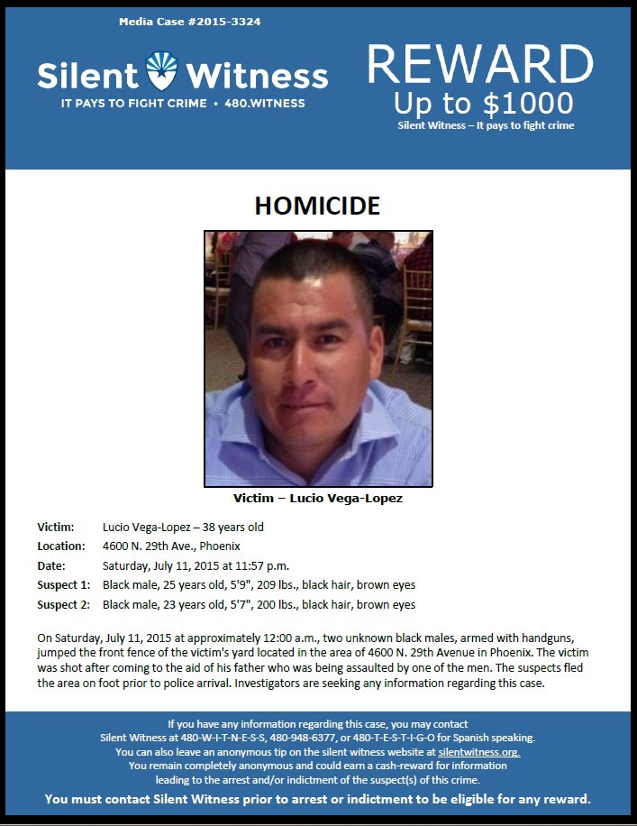 A quiet Saturday evening in a Phoenix neighborhood was shattered by violence that ended in the death of Lucio Vega-Lopez. In the early hours of July 11, 2015, at approximately 12:00 a.m., two unknown Black males armed with handguns jumped the front fence of a residence in the area of 4600 N. 29th Avenue.