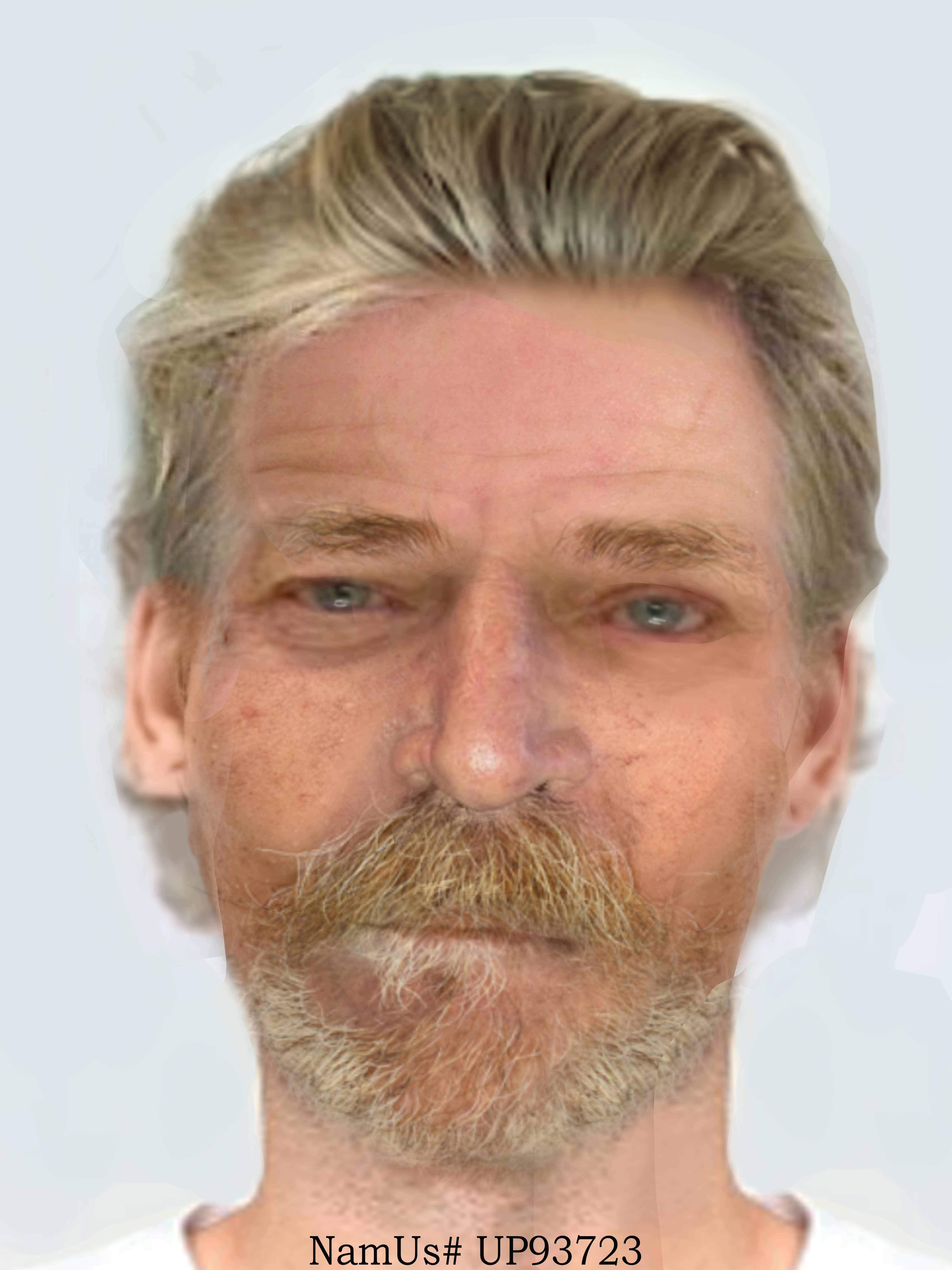 Full head of white/blond hair.