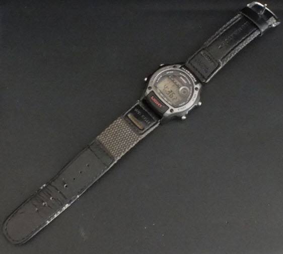 Black hair which is pulled back with an elastic band