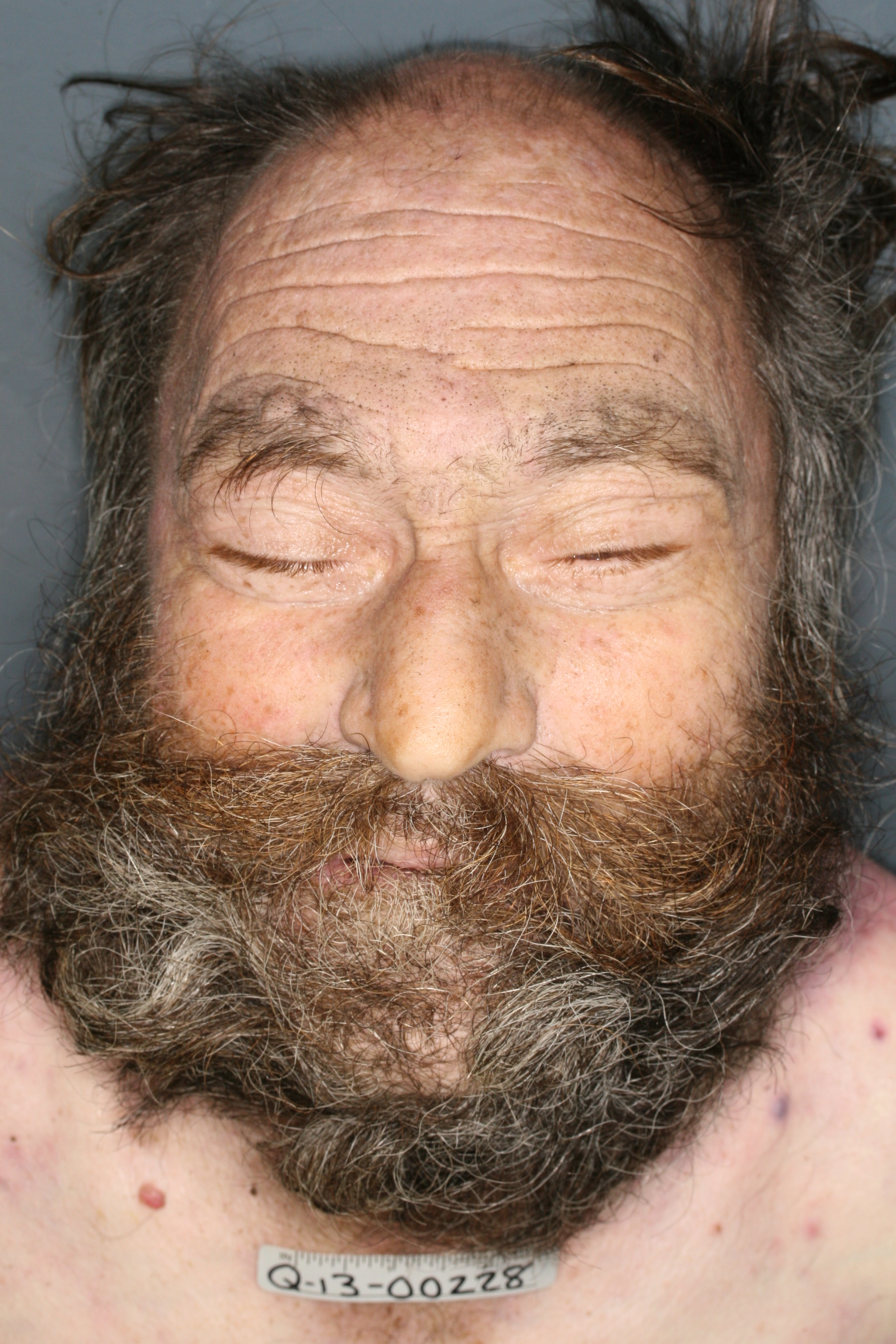 Partial balding, straight /brown/white hair up to 3" in length.