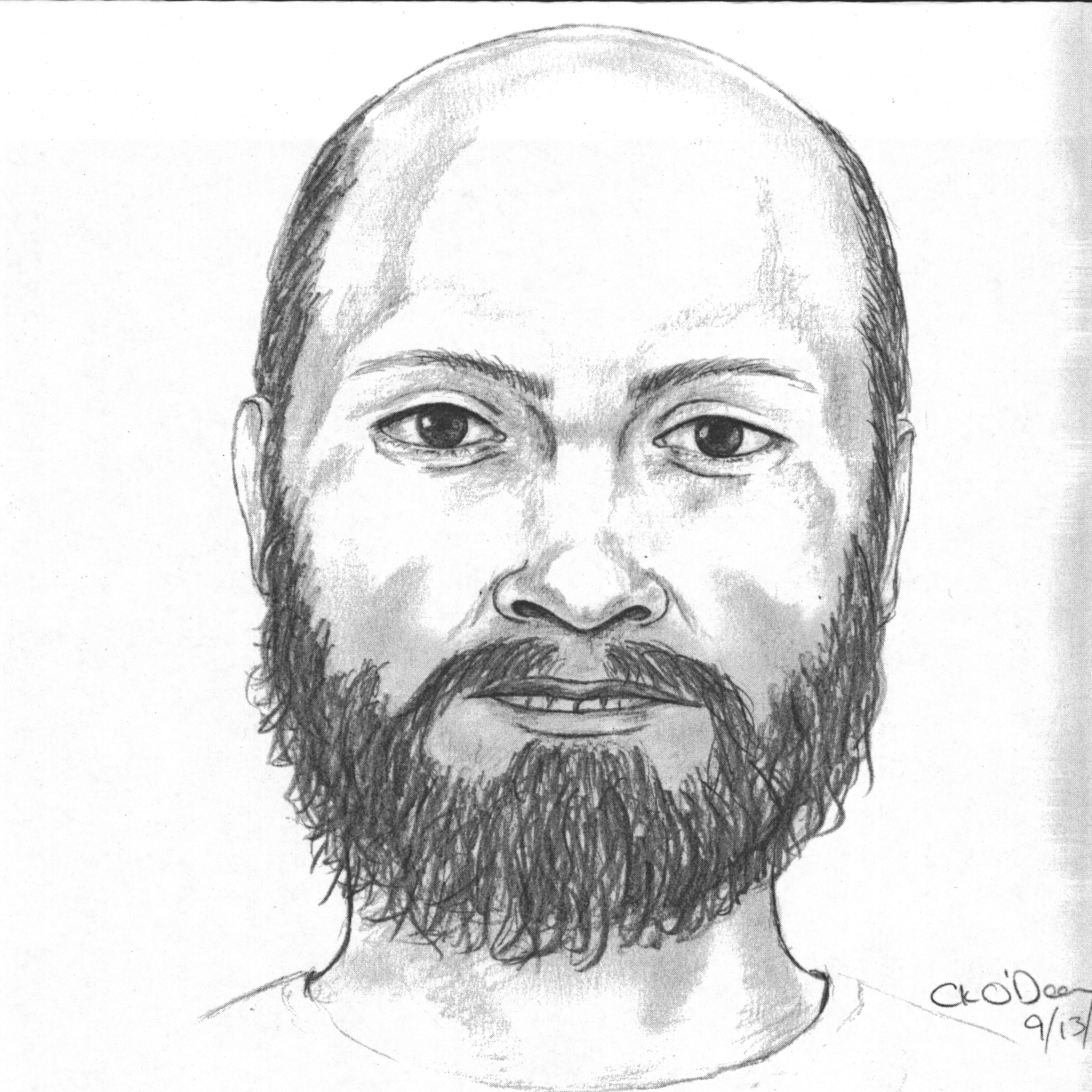 Balding on top/front, hair on sides of scalp gray-brown 14 cm in length